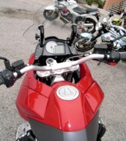 Andiamo fuori ad attendere la Stelvio in prova e la vediamo arrivare, linea filante, ma muscolosa, rossa e con due occhioni! Si perché il doppio fanale orizzontale può piacere o meno ma, sicuramente da personalità a questa tuttoterreno. Siamo gli ultimi in lista per il test così ne approfittiamo per ascoltare le opinioni degli altri tester che ci hanno preceduto. A chi è piaciuta e a chi meno, ma a tutti ha lasciato un impressione abbastanza profonda a mio parere. Al primo sguardo ricorda sicuramente la rivale BMW 1200 GS, ma poi guardandola bene si iniziano a notare le differenze, che emergeranno meglio nel corso del tiger test ride. Osservandola meglio si notano gli ammortizzatori di generose dimensioni e il doppio disco anteriore di qualità, la moto in test è poi corredata di paramotore a mio avviso indispensabile che contribuisce a caratterizzare bene il mezzo. Attendiamo con ansia il nostro turno approfittando per guardare le altre Guzzi esposte e scambiando pareri con le altre persone presenti. |